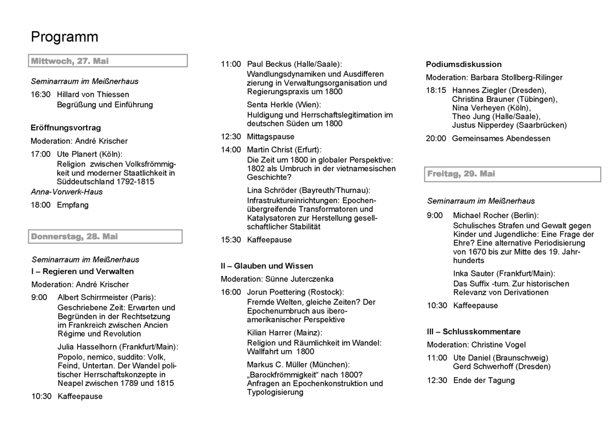 Die Tagung widmet sich dem Epochenumbruch um 1800 aus unterschiedlichen Blickrichtungen und fragt dabei nach neuen Perspektiven im Hinblick auf Epochendiskussionen, Periodisierungsfragen und disziplinäre Selbstverortung sowie nach Einzelaspekten aus den Themenbereichen „Regieren und Verwalten“ und „Glauben und Wissen“.